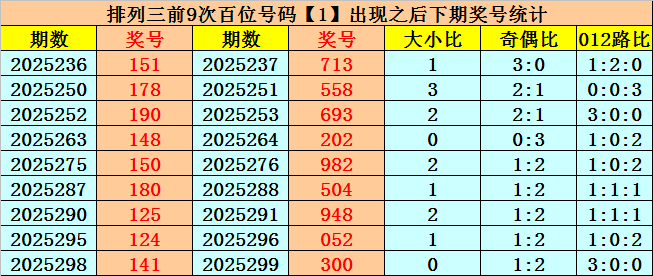 百位号码:百位上期奖号为1路、偶数、大号:1,历史上百位号码1共开出707期,前一次开出期数在第2025298期,上期奖号隔7期再次开出。